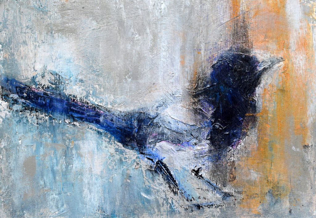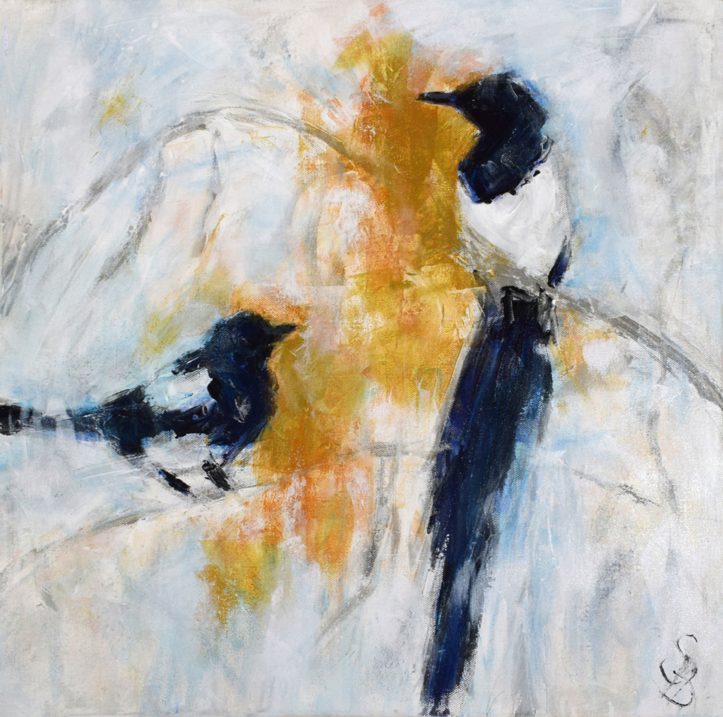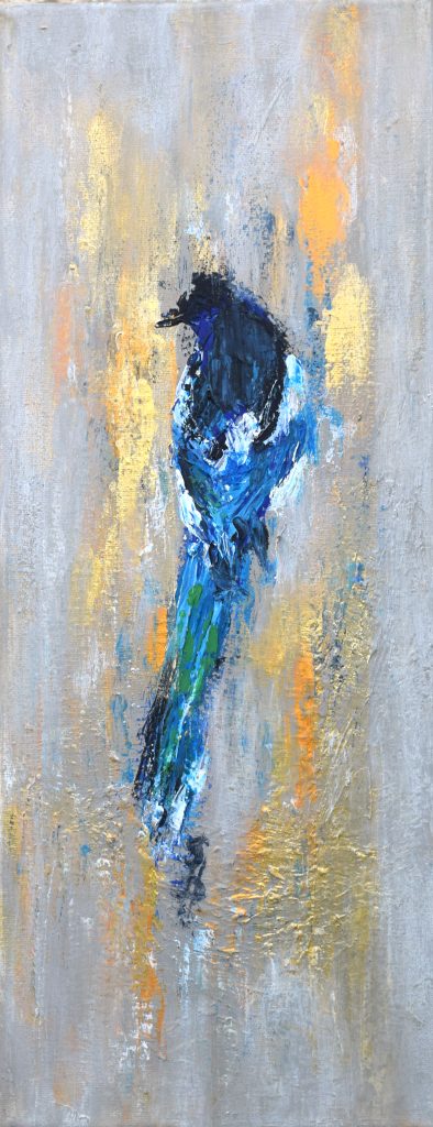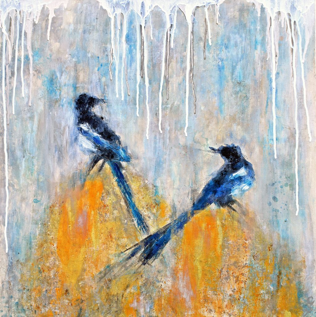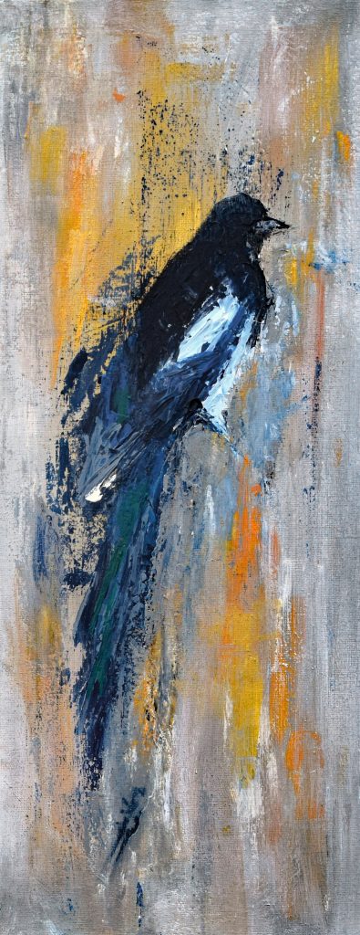 The Magpie paintings are inspired by the beauty and mythology of a bird often misjudged in most Western cultures. From their blue turquoise tinged plumage and the romantic notion that they mate for life, the rhyme of interpreting different numbers of magpies seen together, their purported love of shiny objects, sometimes labelled thieves and flying rats, to their symbolism in Far Eastern cultures of intelligence, luck, happiness and good news: whether they are hated or revered by people has more to do with nurture over nature. Something that resonates throughout life.