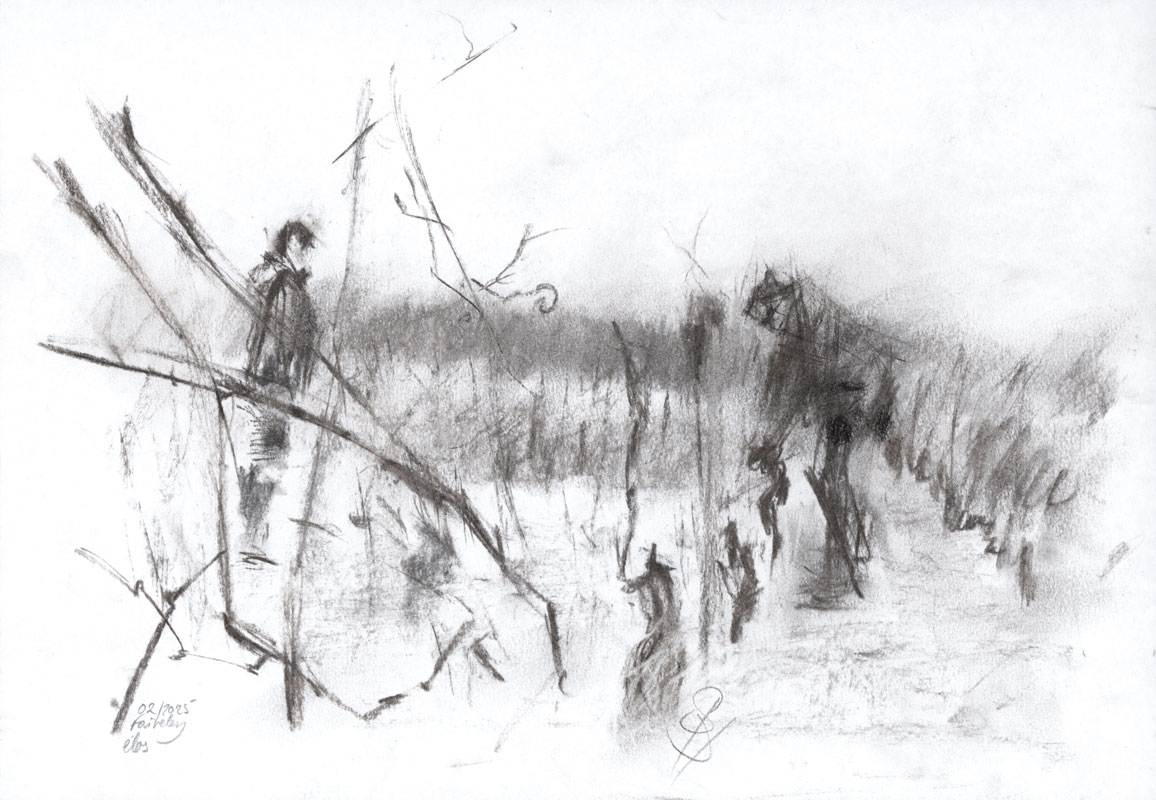 Sketch of pruning in Côtes de Nuits. Team from Domaine Faiveley