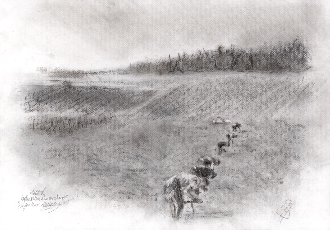 Nursery team planting new vine stock in a whole plot in Mercurey for Collection Tramier.