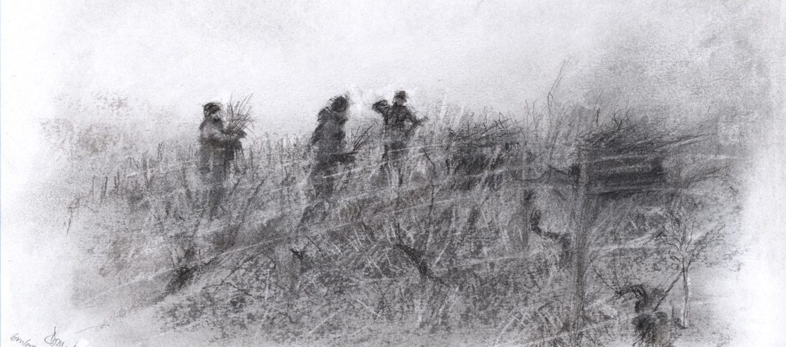 Pruning and burning of vine branches in winter, in a frosty and misty morning.