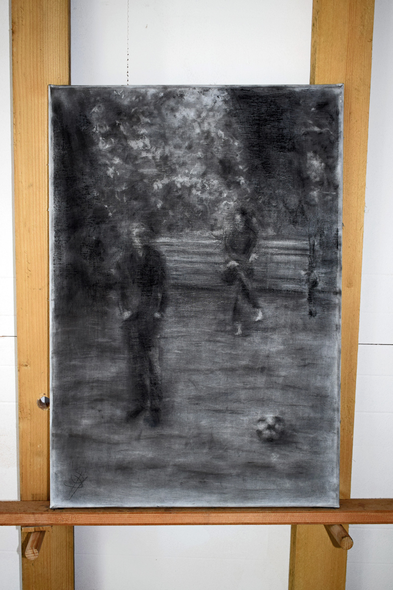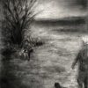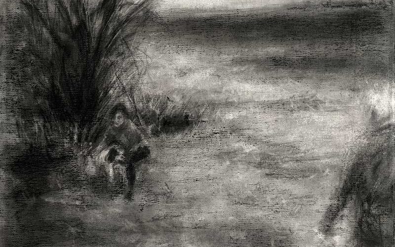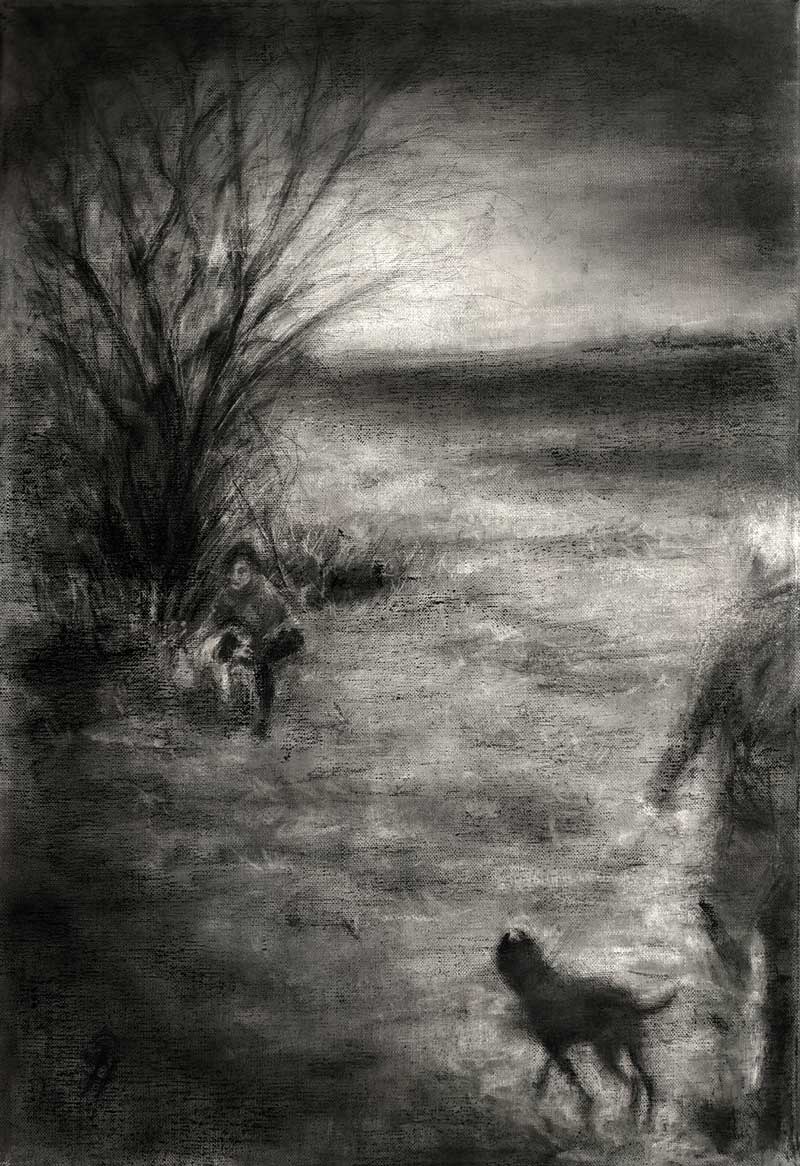 Original is in charcoal on stretched linen, with side tacks. All charcoal works are sprayed with several coats of fixative. Hooks and wire added to back for hanging before sending.